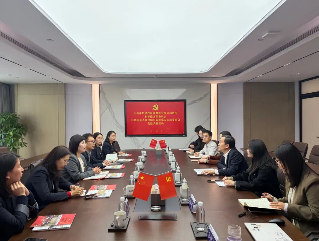 10月30日下午,中共山东齐鲁律师事务所第五支部委员会与中共中信建投证券股份有限公司济南和平路支部委员会在我所共同开展党建共建活动。中信建投证券股份有限公司济南和平路党支部书记、营业部经理张颖,营业部副总经理张博文、于婧等党员代表,山东齐鲁律师事务所第五党支部书记、管委会副主任白文刚,党委委员、合伙人刘媛,合伙人孟庆英、陈建滨及党员、律师代表共同参与活动。