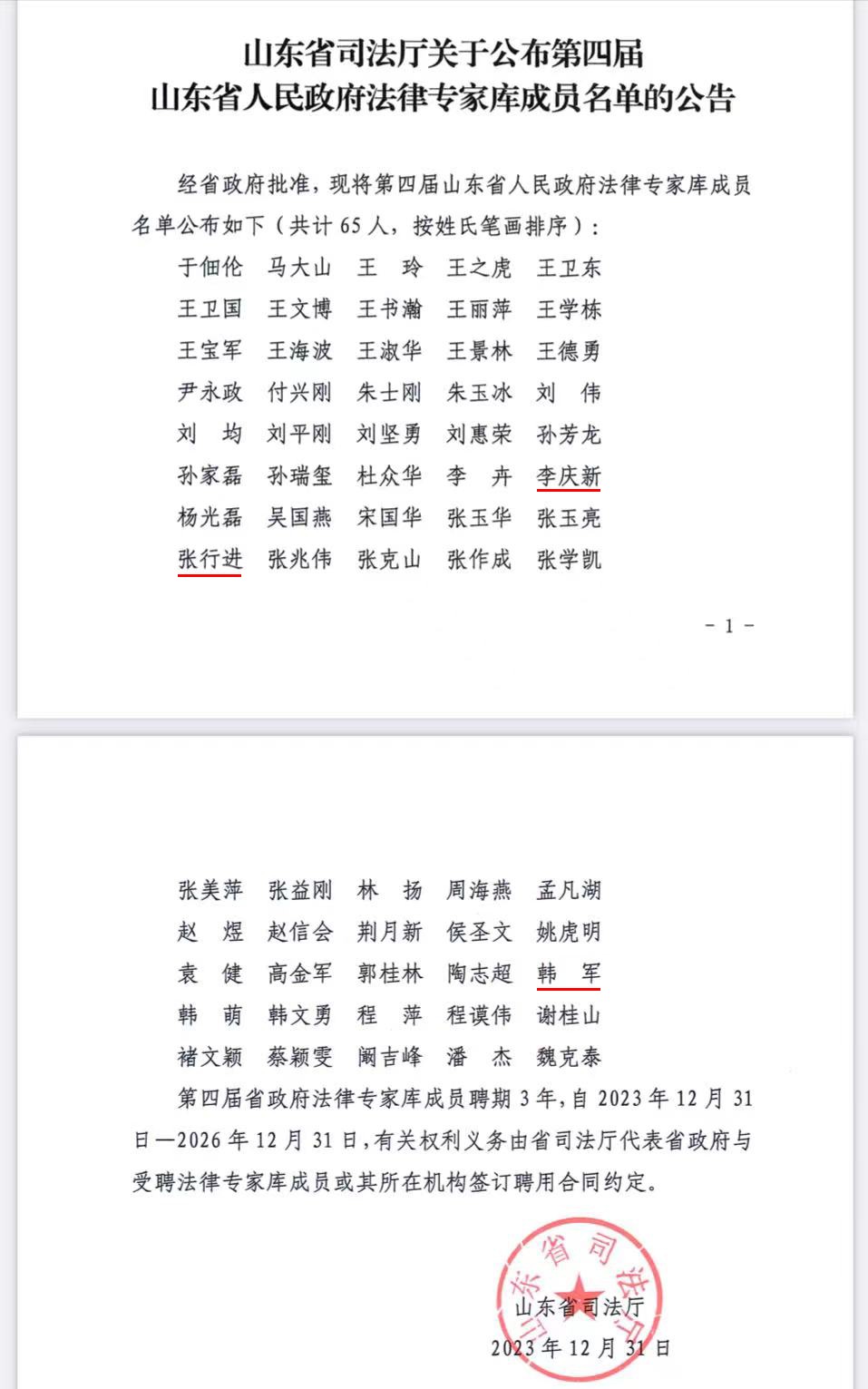 为加强法治政府建设,深入推进依法行政,近日,山东省司法厅公布第四届山东省人民政府法律专家库成员名单,我所李庆新、韩军、张行进入选,聘期3年,有关权利义务遵照相关制度规定由山东省司法厅代表省政府与受聘法律顾问签订聘用合同约定。