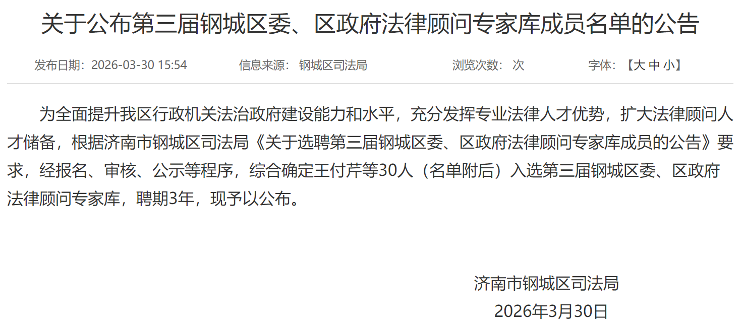 蔡诚律师入选第三届钢城区委、区政府法律顾问专家库,聘期3年。
