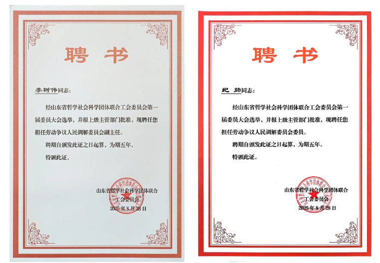 【 济南总所 】齐鲁律师事务所李树伟律师获聘山东省哲学社会科学团体联合工作委员会劳动争议人民调解委员会副主任、纪帅律师为委员会委员