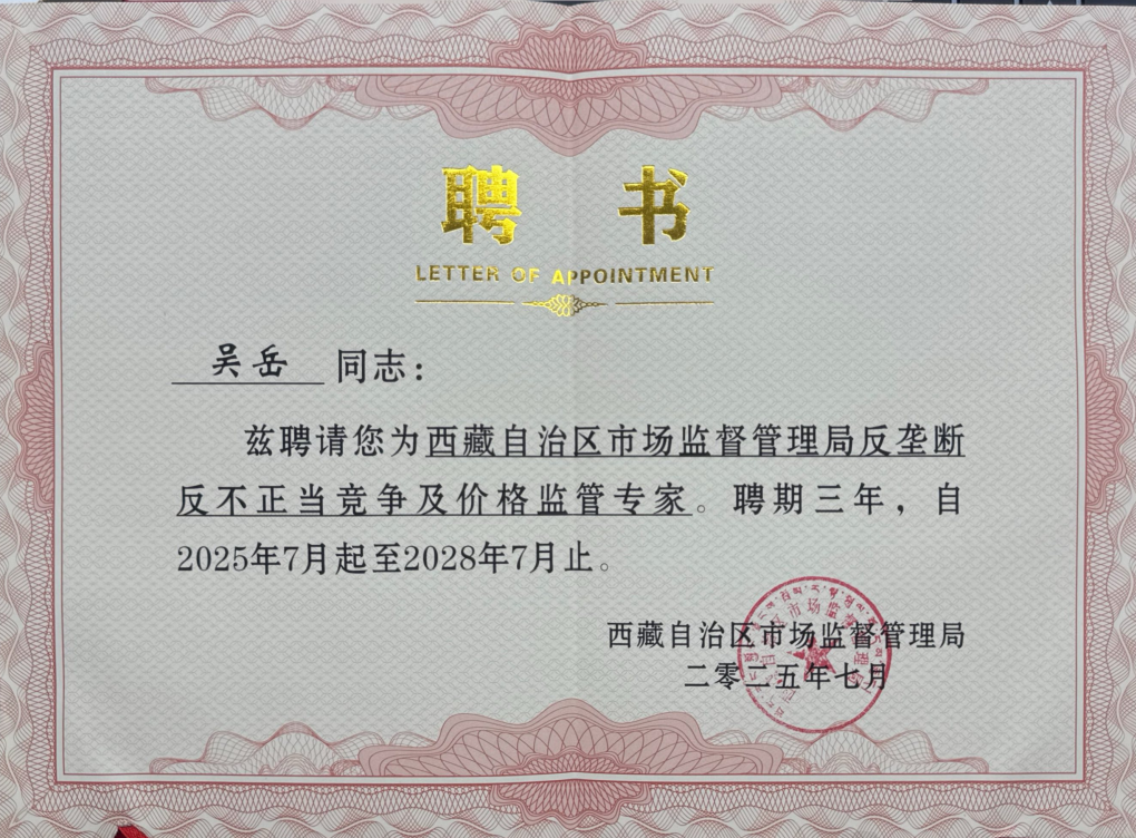 【 济南总所 】齐鲁律师事务所吴岳律师获聘西藏自治区市场监督管理局反垄断反不正当竞争及价格监管专家