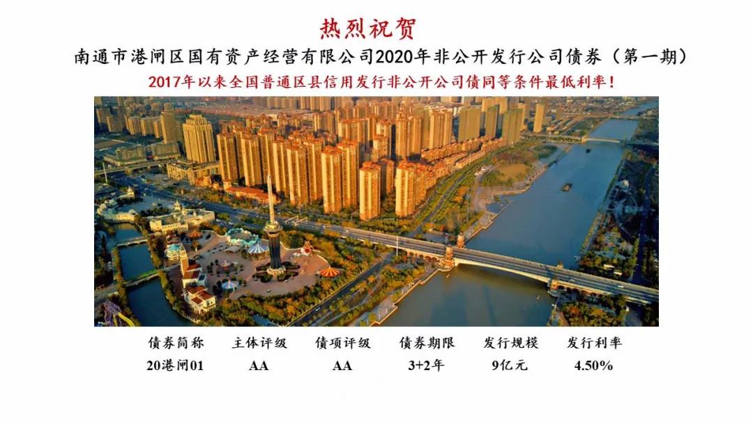 近日,南通市港闸区国有资产经营有限公司2020年非公开发行公司债券(第一期)在上海证券交易所挂牌,发行规模9亿元,发行利率4.5%(债券简称:20港闸01,证券代码:002831)。