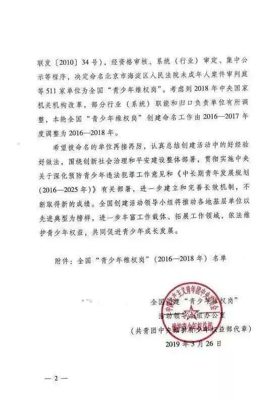 2019年3月26日,共青团中央、司法部命名齐鲁律师事务所为全国“青少年维权岗”。