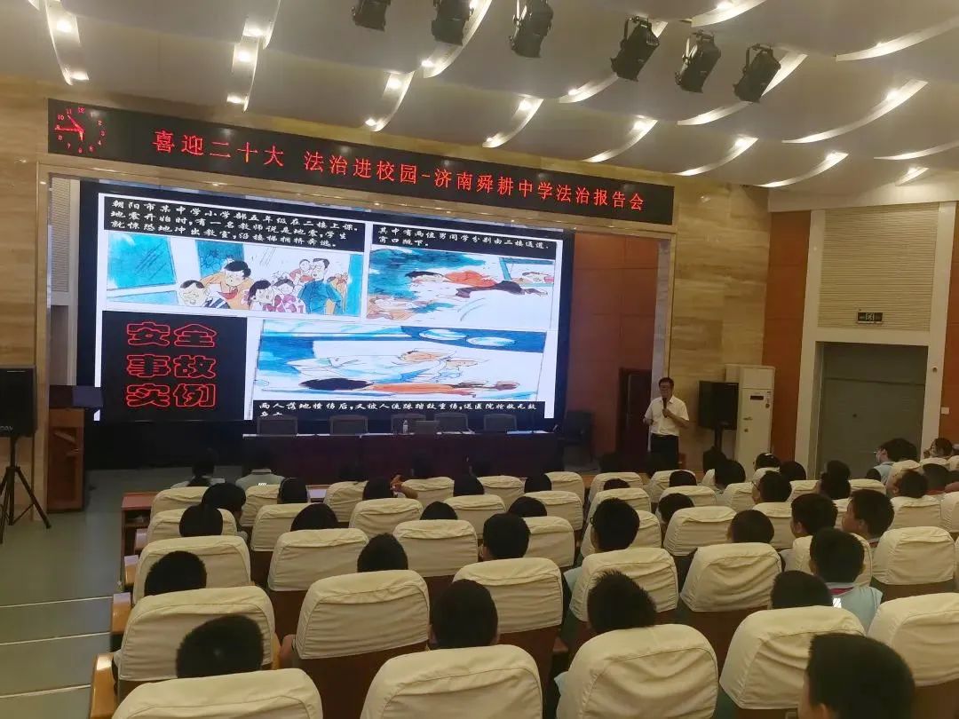 在国庆佳节到来、党的二十大即将召开之际,为增强学生的法治意识,建设和谐平安校园,2022年9月29日下午,济南舜耕中学邀请齐鲁律师事务所律师、山东省律师协会未成年人保护法律专业委员会主任张行进作“喜迎二十大 法治教育进校园”法治报告。报告会由政教处主任杨坤峰主持, 初一年级学生和班主任参加了报告会。